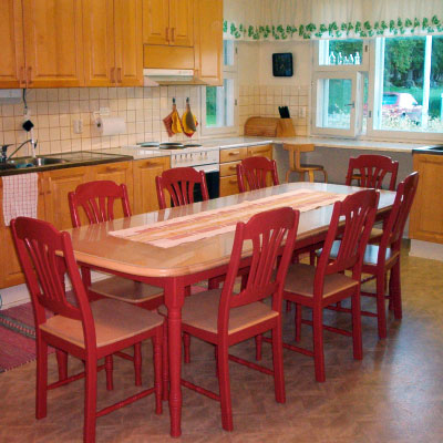 Ruokailu- ja keittiötiloissa korostuu kodinomaisuus. Viihtyisästä oleskelutilasta löytyy takka, leivinuuni, televisio, DVD-soitin sekä stereot.